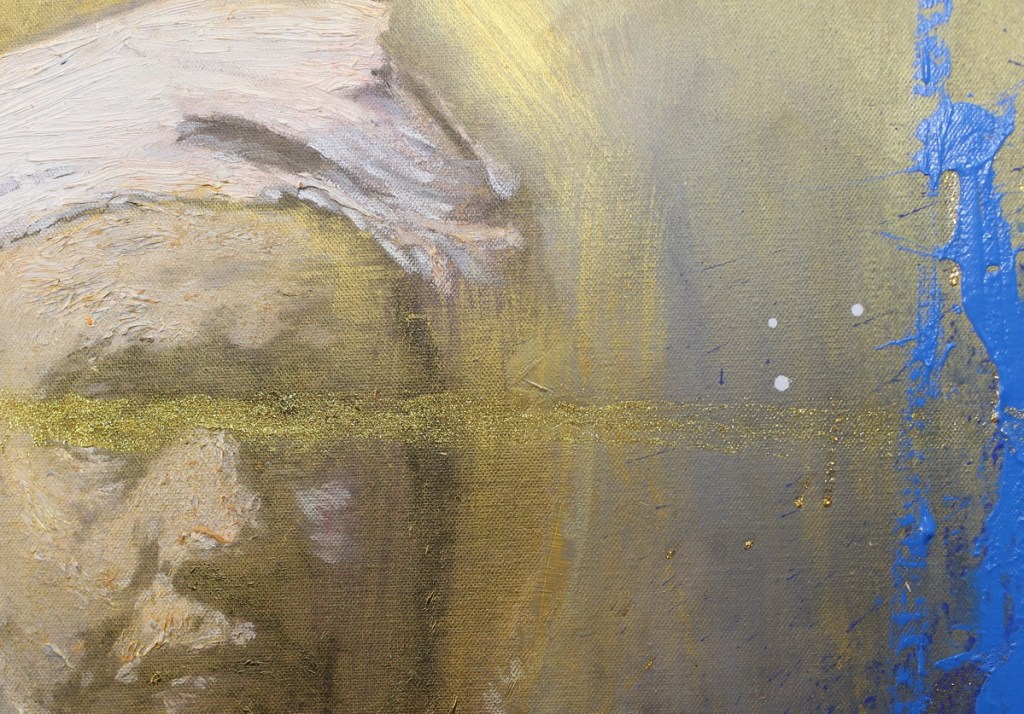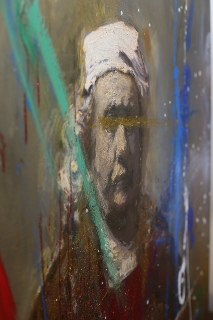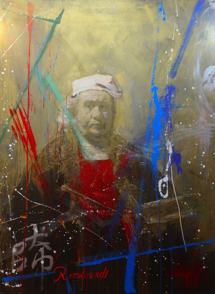 羅卓睿的《林布蘭自畫像與雙圓》是古典與現代藝術風格結合的鮮活例證。他使用的閃亮片段和丙烯,這些材料通常與流行藝術和抽象藝術相關,與古典主題和構圖形成鮮明對比。這種對比產生了一種吸引人的視覺張力,讓觀眾深入探索。