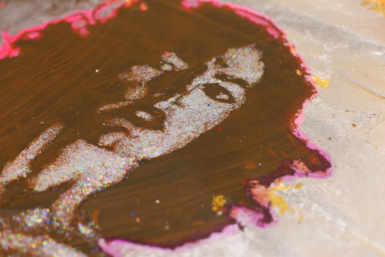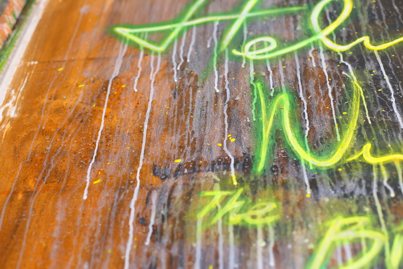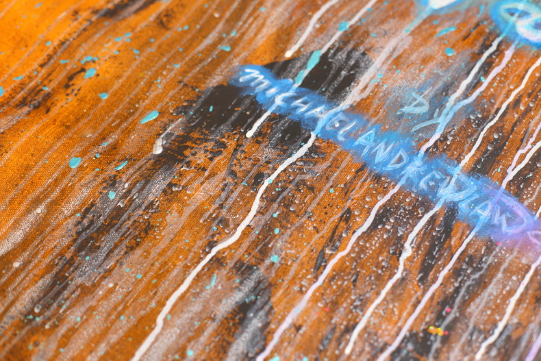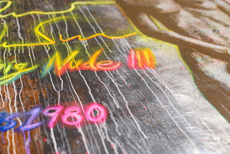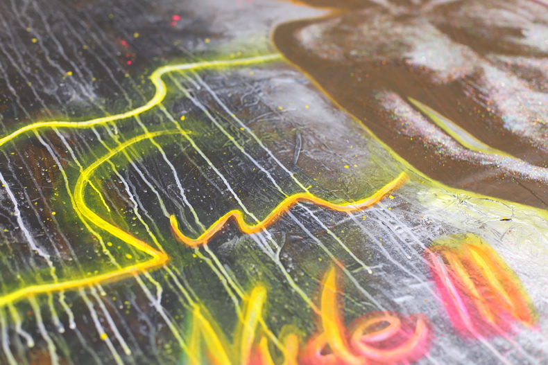 這種螢光塗鴉在銀箔背景上顯得非常突出,驅使觀眾與敘事對話。羅卓睿已經將畫布轉變成一個發光的手稿,其中明亮地揭示了紐頓作品的故事和他自己的詮釋。