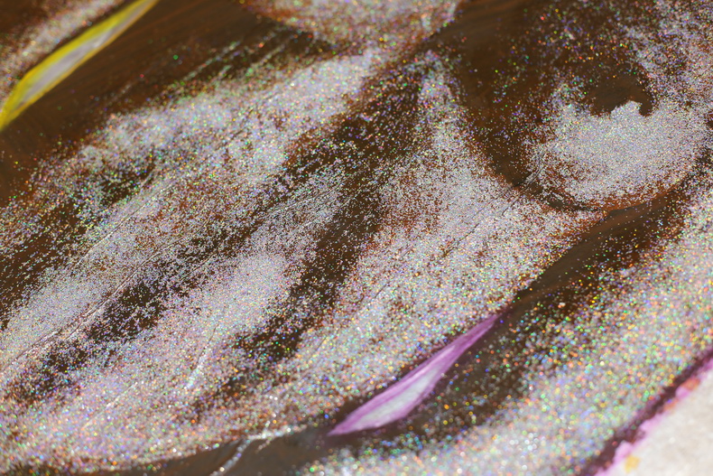 畫作的背景是羅卓睿創意最突出的地方。銀箔製成的背景提供了反射效果,使作品增添了深度和立體感。這種如鏡的背景不僅提高了藝術品的美學吸引力,而且巧妙地將觀眾及其周邊環境融入到畫作的敘事中。