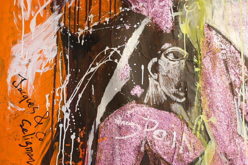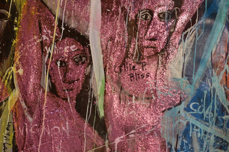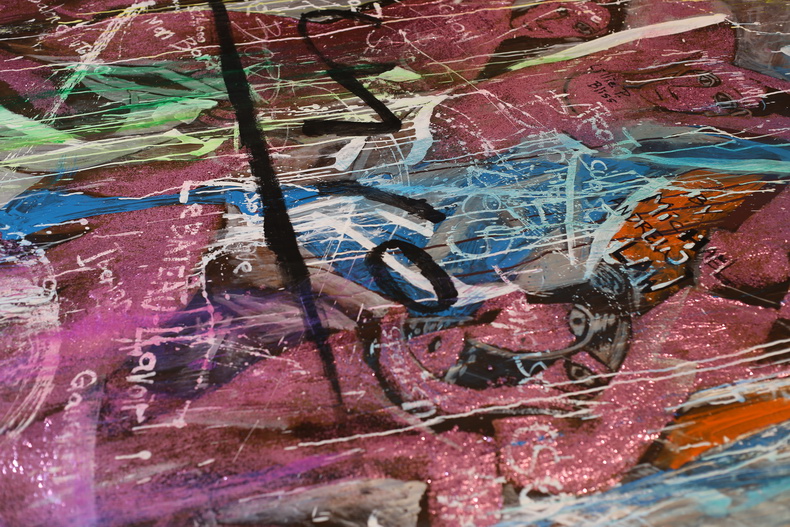Law’s rendition of “Les Demoiselles d’Avignon” is an expansive piece, measuring 200×200 cm, that uses glitter, oil, acrylic, and diamond dust in a strikingly expressive manner. The sparkle of the glitter and diamond dust juxtaposes with the rich depth of the oil and acrylic, creating a dazzling effect that brings Picasso’s iconic work to life in a new light.