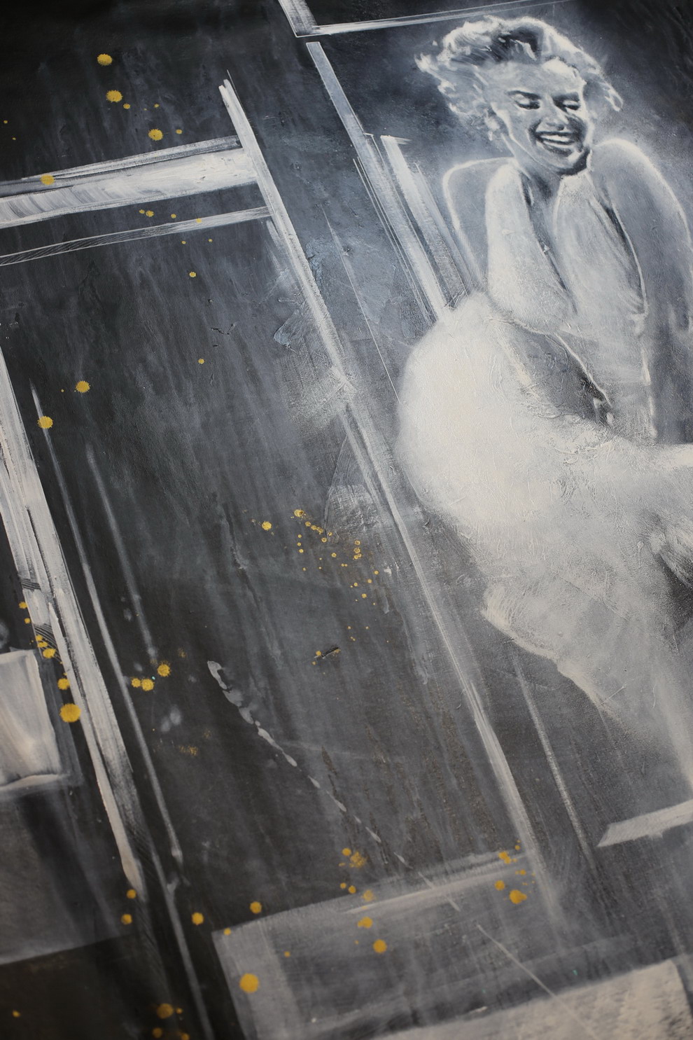「ブロークン・ドリームスのブールバードでのマリリン・モンロー」は、モンローの象徴的な姿を巧みに描いています。彼女が地下鉄の風によってスカートが舞い上がるシーンは、1950年代のハリウッド映画の象徴的な瞬間であり、今日まで影響力を持ち続けています。このイメージは、モンローの優雅さと、彼女が持つ性的な魅力と無邪気さを象徴しています。