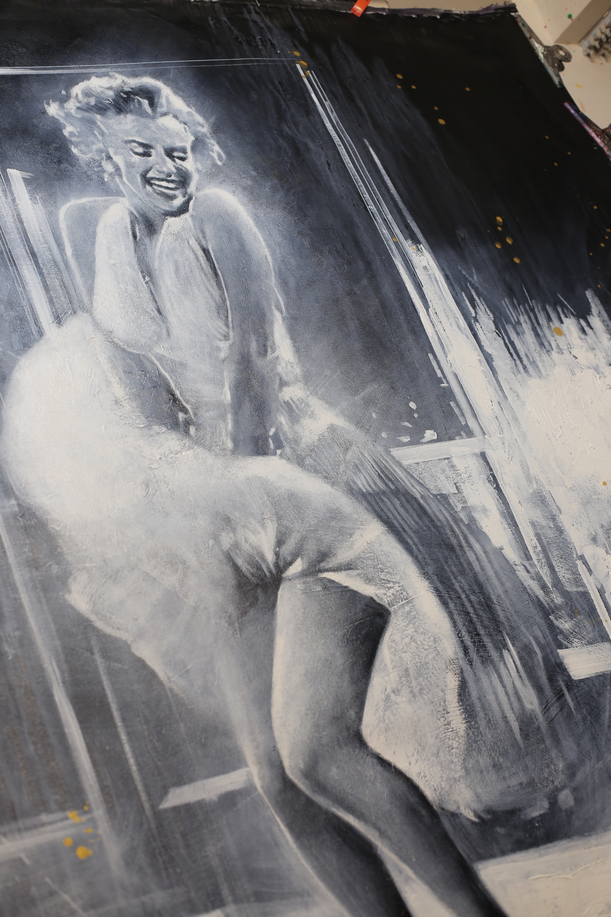 マイケル・アンドリュー・ローは、この有名なシーンを大胆かつリアルな描写で再現しました。彼の作品は、モンローの美しさと無邪気さを捉えると同時に、彼女の人生における複雑さと脆さを強調しています。これは、ヘルンヴァインが「ブロークン・ドリームスのブールバード」で描いたハリウッドのアイコンたちの孤独と絶望を反映しているかのように見えます。
