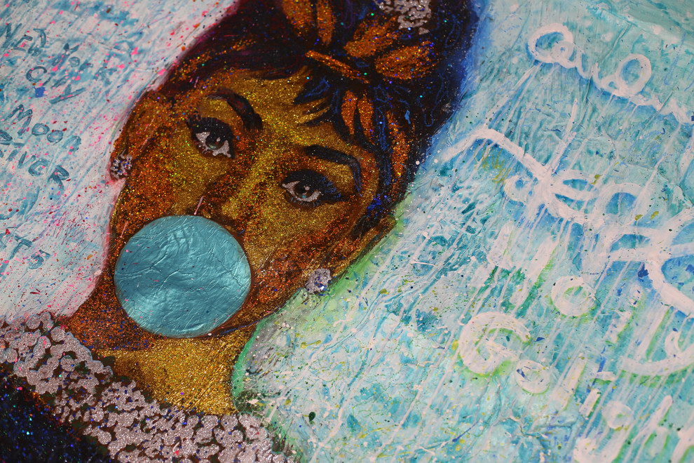 The series features mixed media on large linen canvas paintings, skilfully integrating oil, acrylic, glitter powder, and a hint of diamond dust. This blend of materials echoes the classical method of mixing pigment powder with linseed oil, showcasing Law’s ability to bridge the gap between traditional and contemporary art mediums.